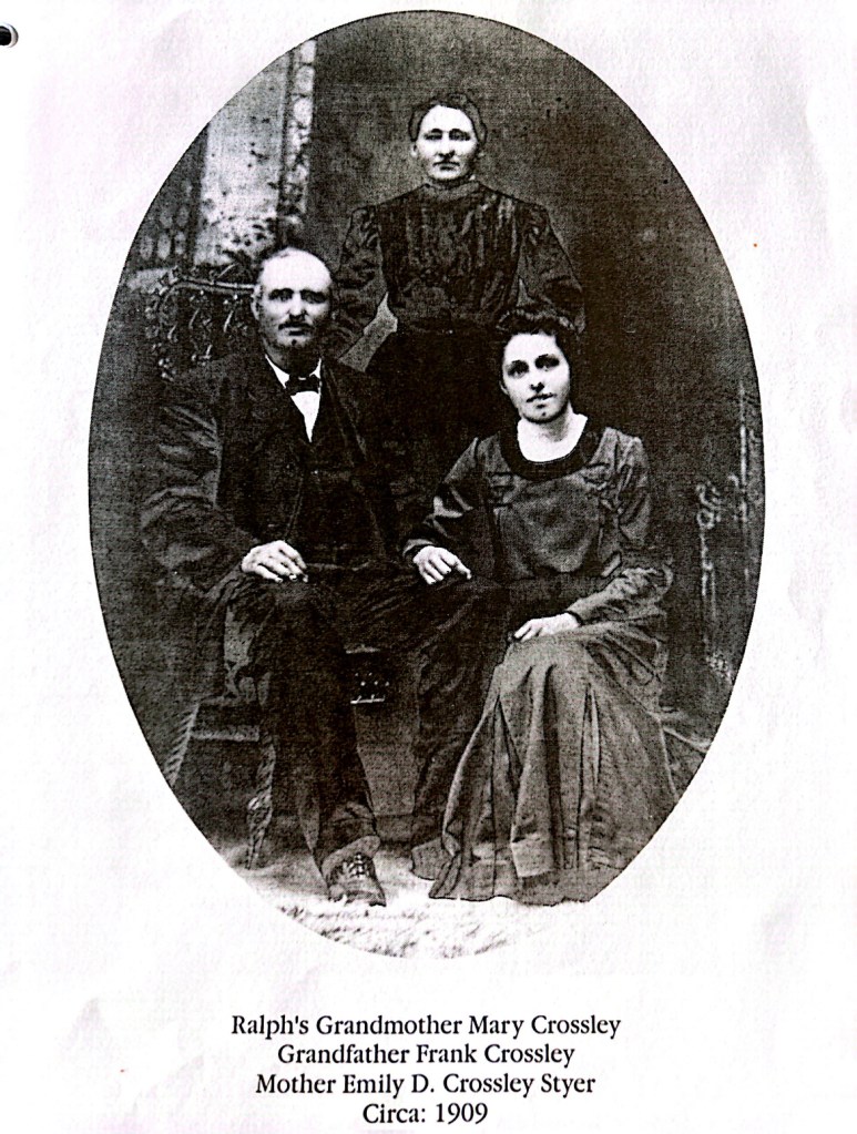 Grandpa Frank’s prosthetic leg made farming impossible, so he and Catherine moved in with their daughter and son-in-law, Emily and Charles Styer in Liberty Township. Kay Heim told me that though disabled, Frank Crossley insisted in “doing his part” to not be a burden the family- so he cut firewood every day for the stove and would drive the wagon during harvest season.